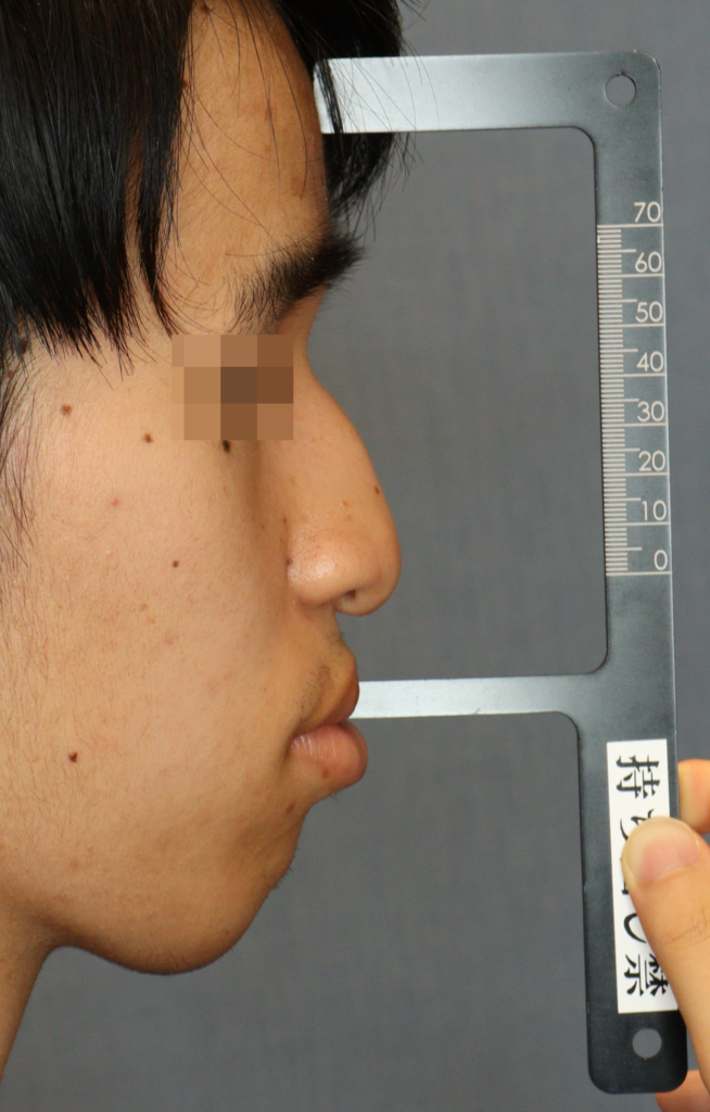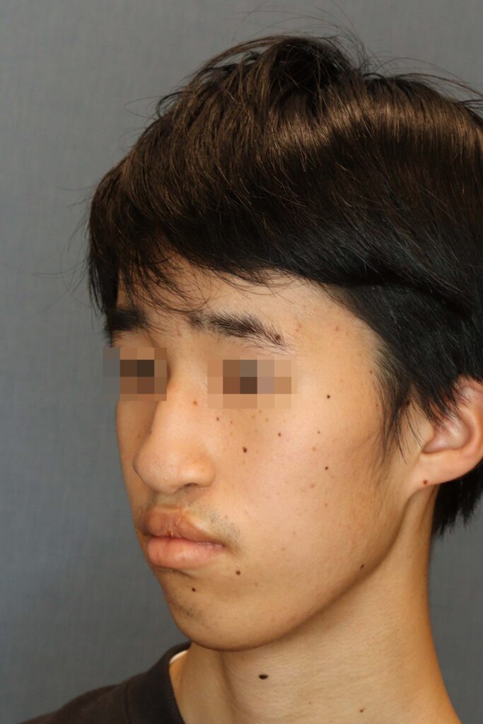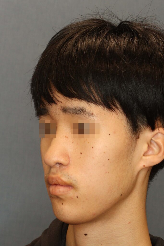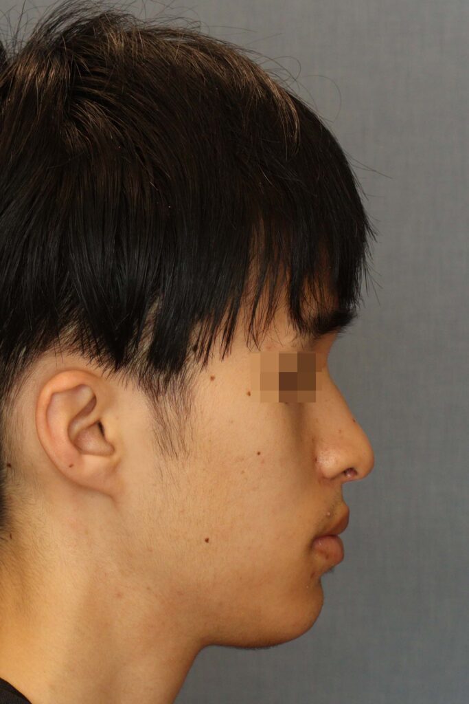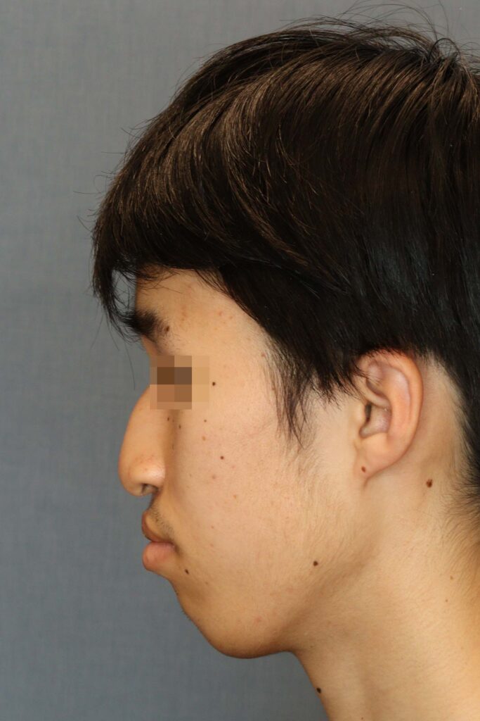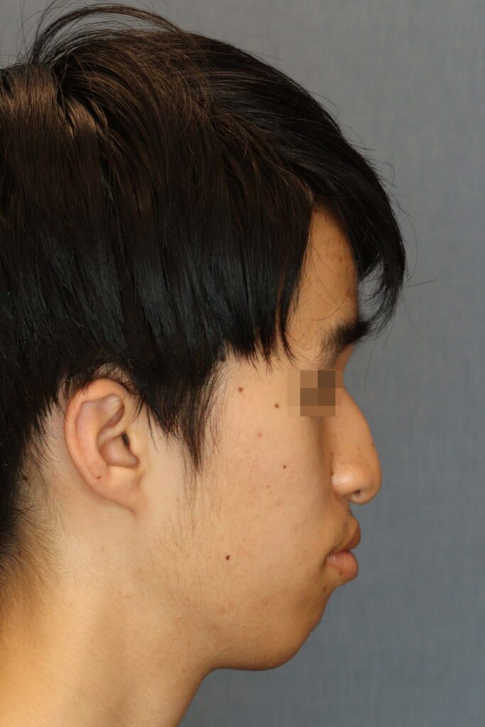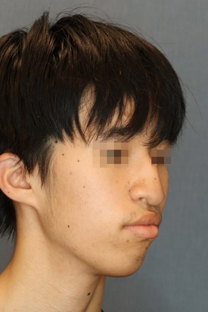 術前の顔貌では、鼻の変形に加えて、口唇閉鎖時の筋緊張が強く、オトガイ後退に伴う口唇閉鎖不全を認めました。