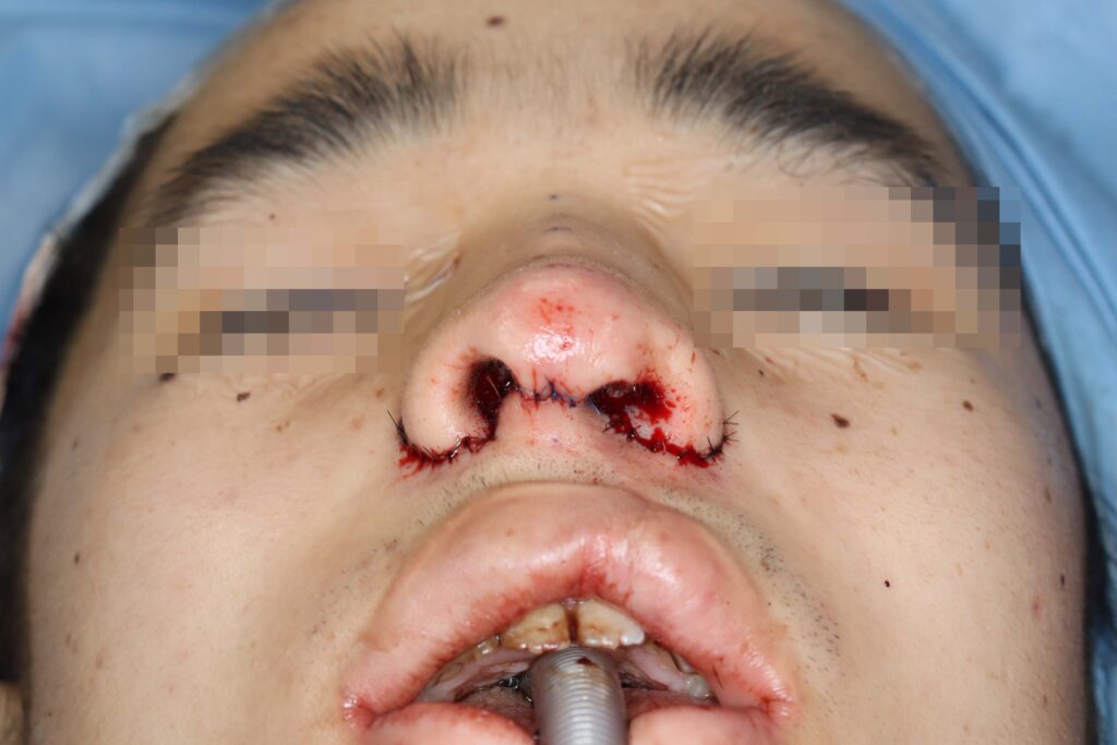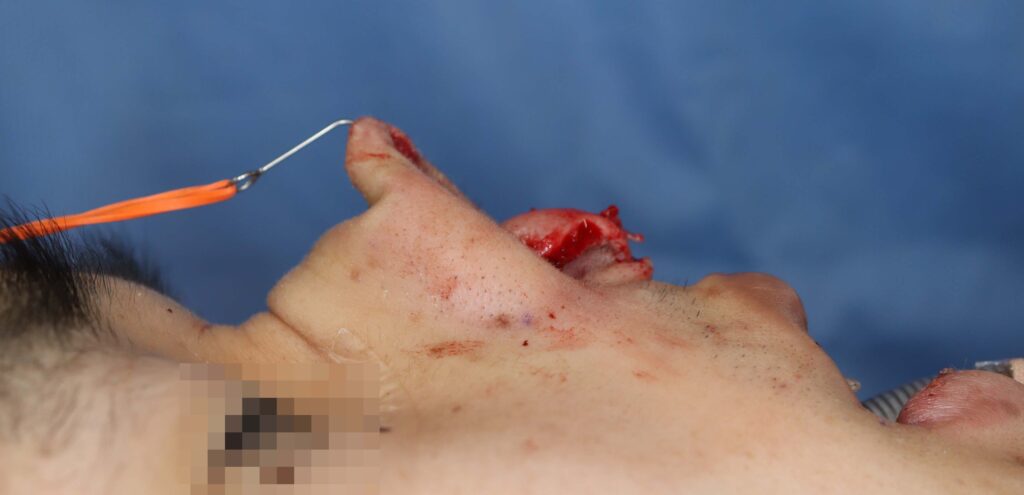 オープン法でアプローチし、湾曲した鼻中隔を切除しました。