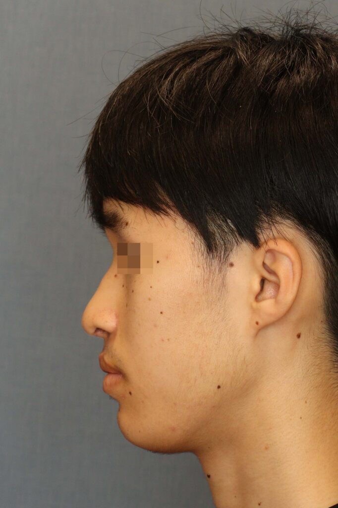 術後3ヶ月の時点で鼻形態は良好に改善し、オトガイ前進によりバランスの取れたE-lineが形成されています。