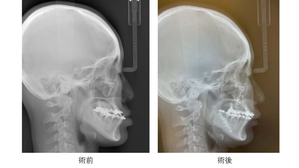 下に示したのが、手術前と手術後の側面セファログラム(横顔のレントゲン写真)です。骨の位置関係を比較することで、あごがどのように移動し、顔全体のバランスがどのように変化したかを客観的に確認することができます。