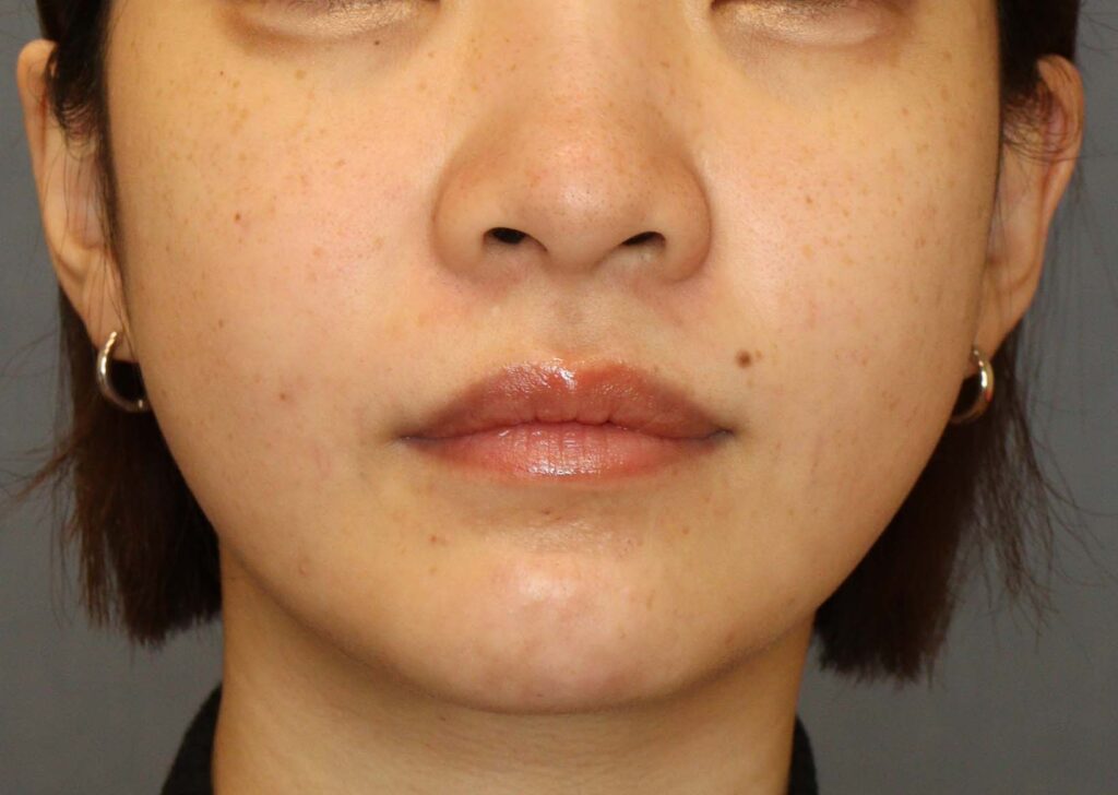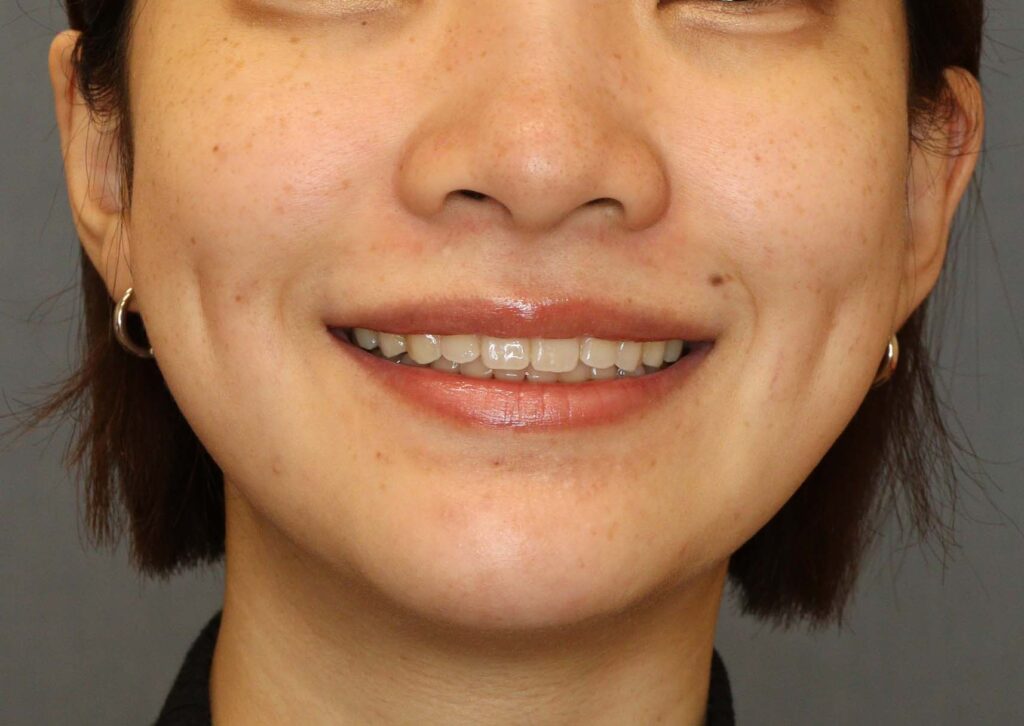 術後はかみ合わせは良好になり、ガミースマイルは消失し、オトガイが前方にでて口が閉じやすくなりました。E-lineも整いました。